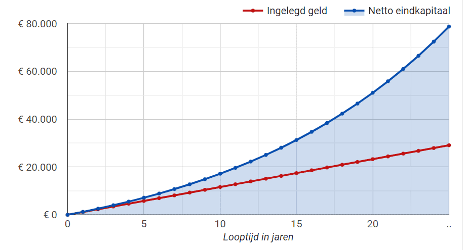Uiteindelijk, na 25 jaar, heb je 25*12* €100 = €30.000 ingelegd. Echter, dit geld is na 25 jaar bijna verdriedubbeld zoals je ziet. Na 10 jaar zie je al een redelijke winst in bovenstaand grafiek. Ondanks dat deze cijfers geen garanties kunnen bieden op de verloop van je investeringen, is dit wel oprecht een gemiddeld beeld. Ziet er een stuk beter uit dan op je spaarrekening of niet?