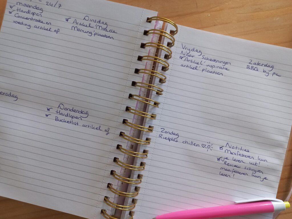 Hoe is dit anders dan jouw maanddoelen en weekdoelen? Nou, op een to-do lijstje schrijf ik bijvoorbeeld ook schoonmaakklusjes. Ook simpelweg ‘opzet maken artikel …’ kan hier bijvoorbeeld opstaan. Dus een soort subdoel van de punten die ik dan weer wel benoem in mijn week- en maandplanning. Het is echt een complete lijst die je de avond van te voren of de ochtend zelf samenstelt.